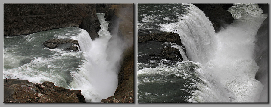 | Wir schlenderten die Wege ab, immer bestrebt Größen und Proportionen dieses Naturereignisses zu begreifen, was einfach nicht gelingen wollte. Erst wenn man Menschen in Bezug setzen konnte, wurde einem die wahre Größe des Gullfoss bewusster. |