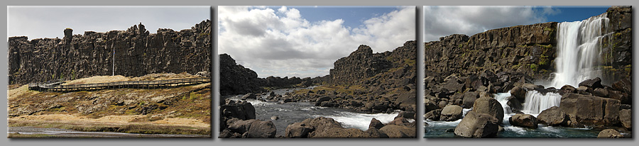 | In der Schlucht Almannagjá muss das Wasser des Öxará ein paar Höhenmeter überwinden und schafft damit einen äußerst fotogenen Wasserfall, den Öxarárfoss. Ein wunderbarer Ort um seine Seele baumeln zu lassen und Ruhe zu finden. Seltsamerweise waren kaum andere Besucher am Öxarárfoss interessiert, na ja, vielleicht hatten wir einfach nur Glück. |