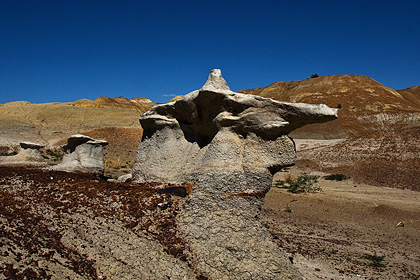 | nicht am frühen Morgen oder so wie wir am späten Nachmittag erkundet wird durch das gleißende Licht der hochstehenden Sonne auf seinen Fotos kaum was Farbiges entdecken können. Übrigens, wenn es geregnet hat oder Regen droht, ist von einem Besuch der Bisti Wilderness. dringend abzuraten. Der Boden wird zu klebrigem Morast. Bei uns war es glücklicherweise knochentrocken und leicht zu gehen. |