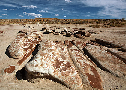 | irgendwann endet und sich eine weite Ebene öffnet. Man sieht vereinzelte Hoodoogruppen, Senken und Hügel die neugierig machen. Es lohnt sich neue Wege zu gehen. Die bereits zu Tode nachfotografierten Formationen ließen wir einfach im Gps und ließen uns immer weiter westwärts treiben bis wir von der "Natureart" genug hatten. Zurück ging es an der Abruchkannte entlang um einen Wiedereinstieg zu finden. |
